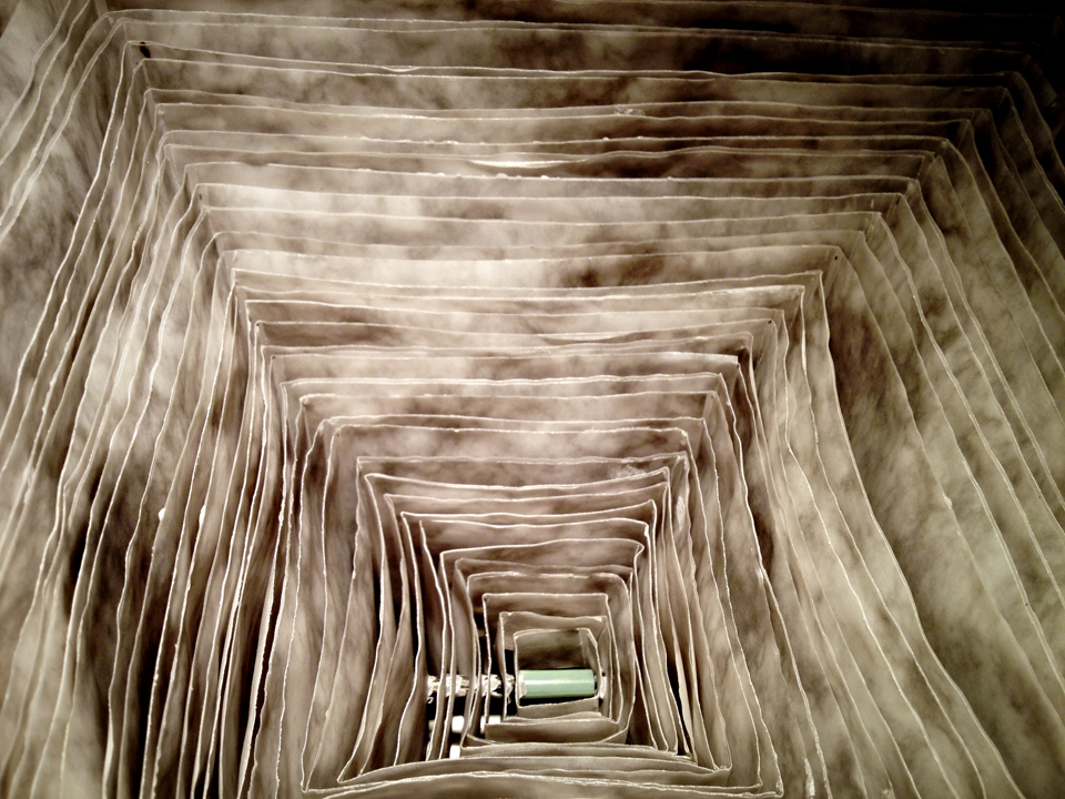 54 pieces, each a maximum size of 20cm3 intersect and interact with several maxi-textile pieces, which allures you into a global universe of fabrics. The vision of the artists of what surrounds them and their interpretation of the contemporary agora made Kyionori Shimada create a labyrinth of nylon fabric and Irene Anton, an “intervention invading network” with tights.